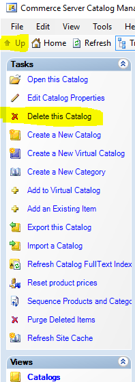 If the catalogs on the details are not visible by default. Please use the "Up" button until you see the catalogs in the details section. Once you see the catalogs on the details side. We can select the catalog and perform actions on that catalog from the Tasks section.